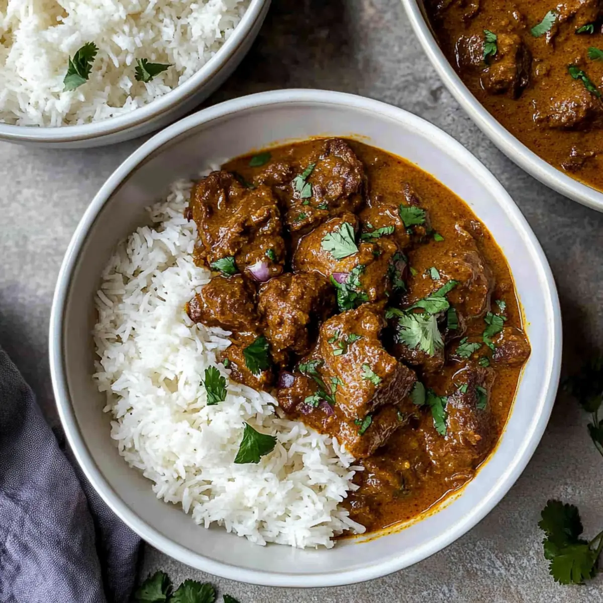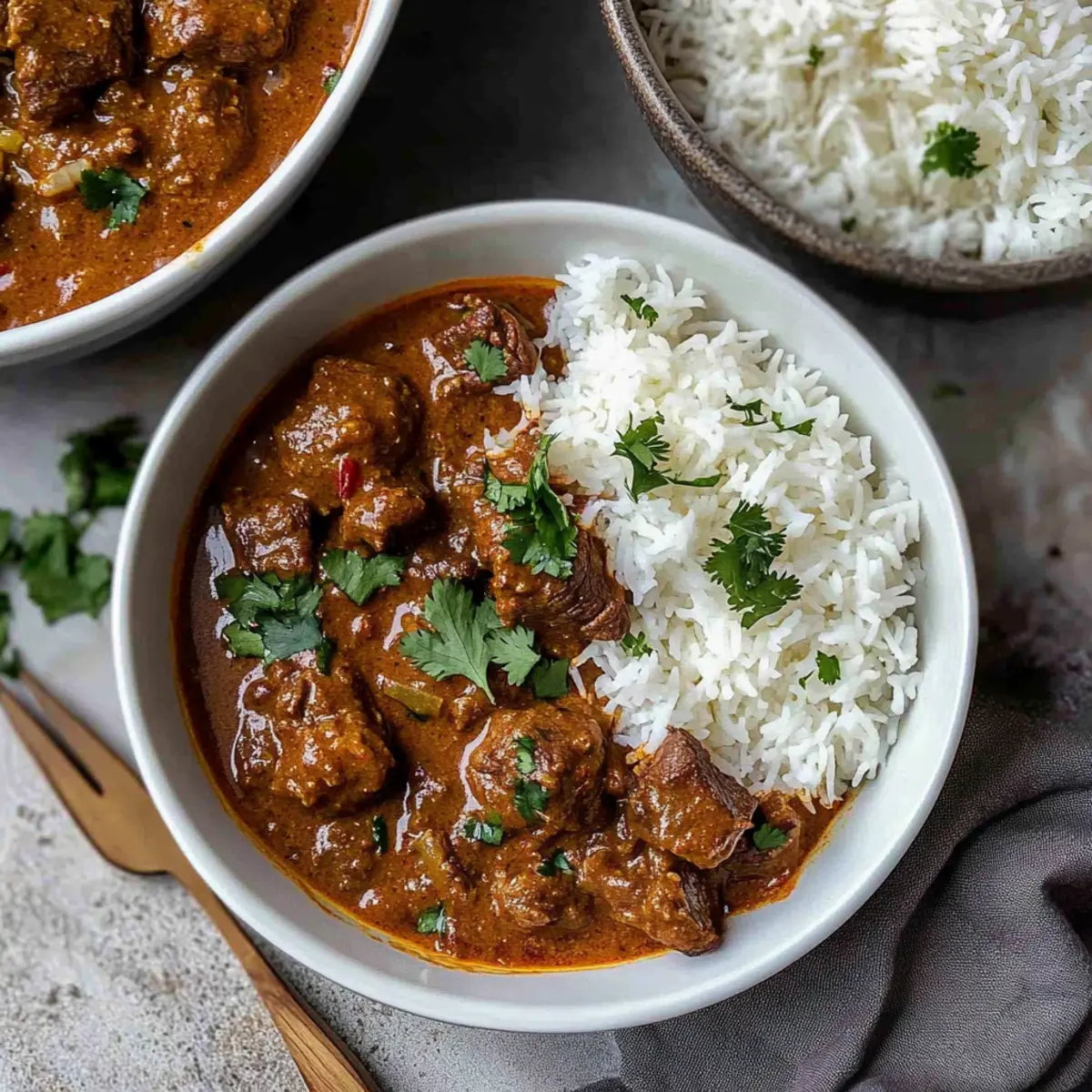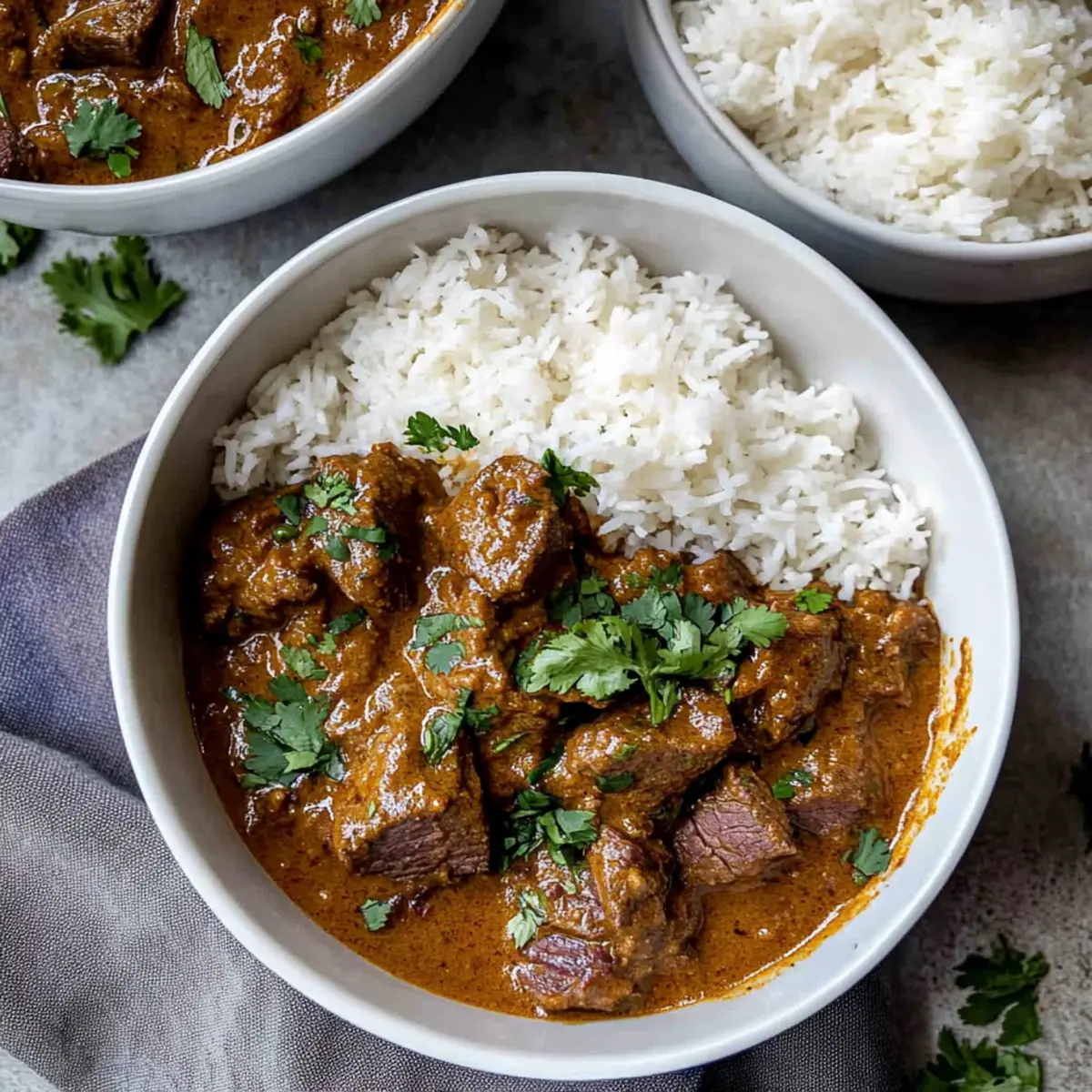 - Once the beef is fork-tender and the curry has thickened, ladle portions over rice or cauliflower rice and garnish with fresh cilantro and yogurt, if desired.