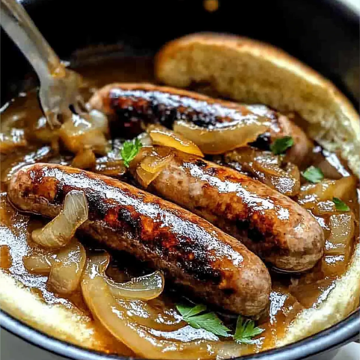Perfect Pairing: Serve on toasted buns topped with the savory beer-onion sauce; your guests will be asking for seconds!
