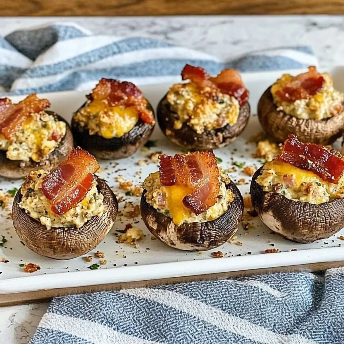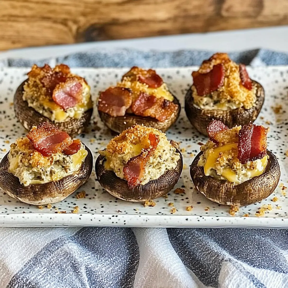 Drizzle melted butter or reserved bacon drippings over each stuffed mushroom for added richness, and then sprinkle breadcrumbs generously on top for a crispy finish. Make sure all the mushrooms are covered, as this will create that nice golden crust during baking.