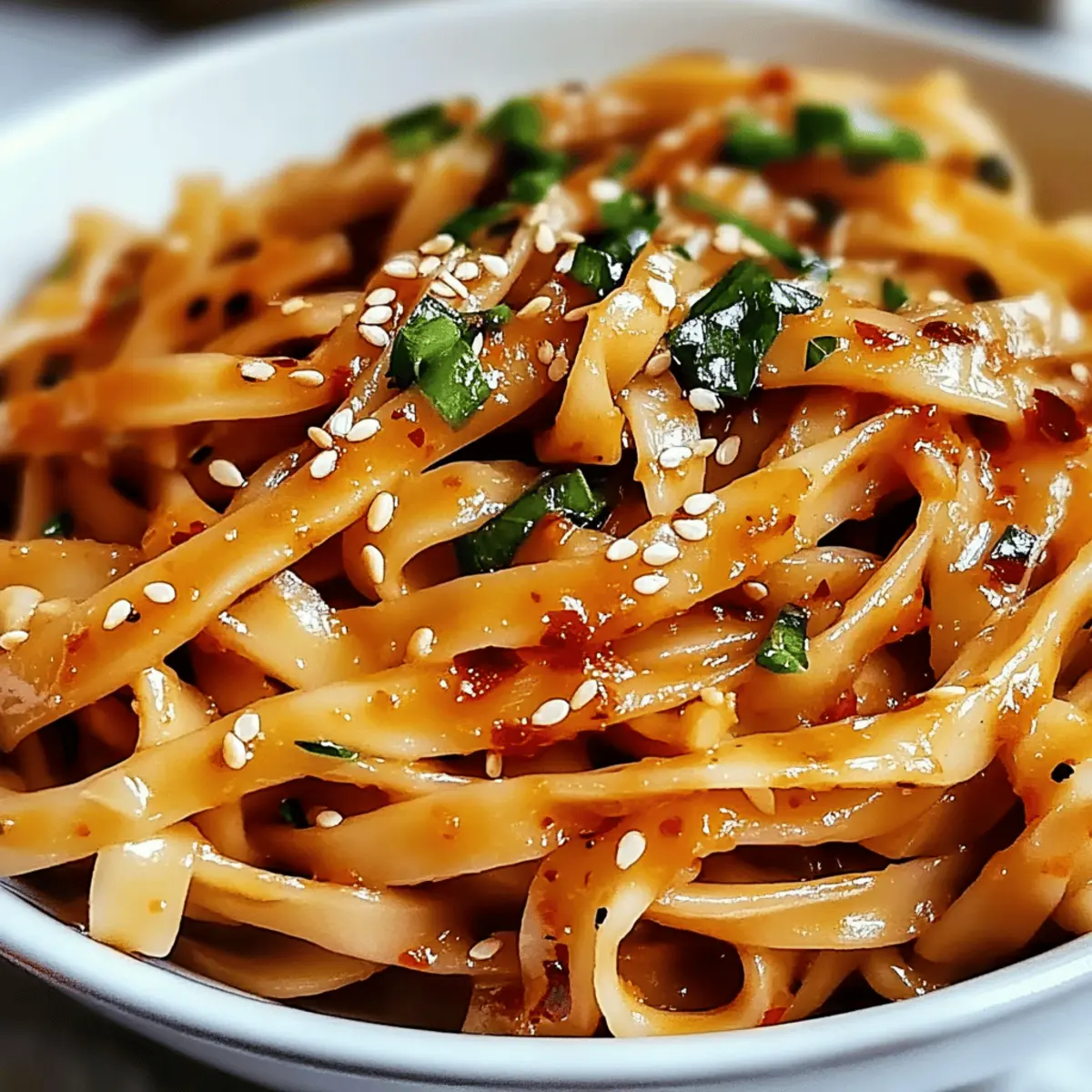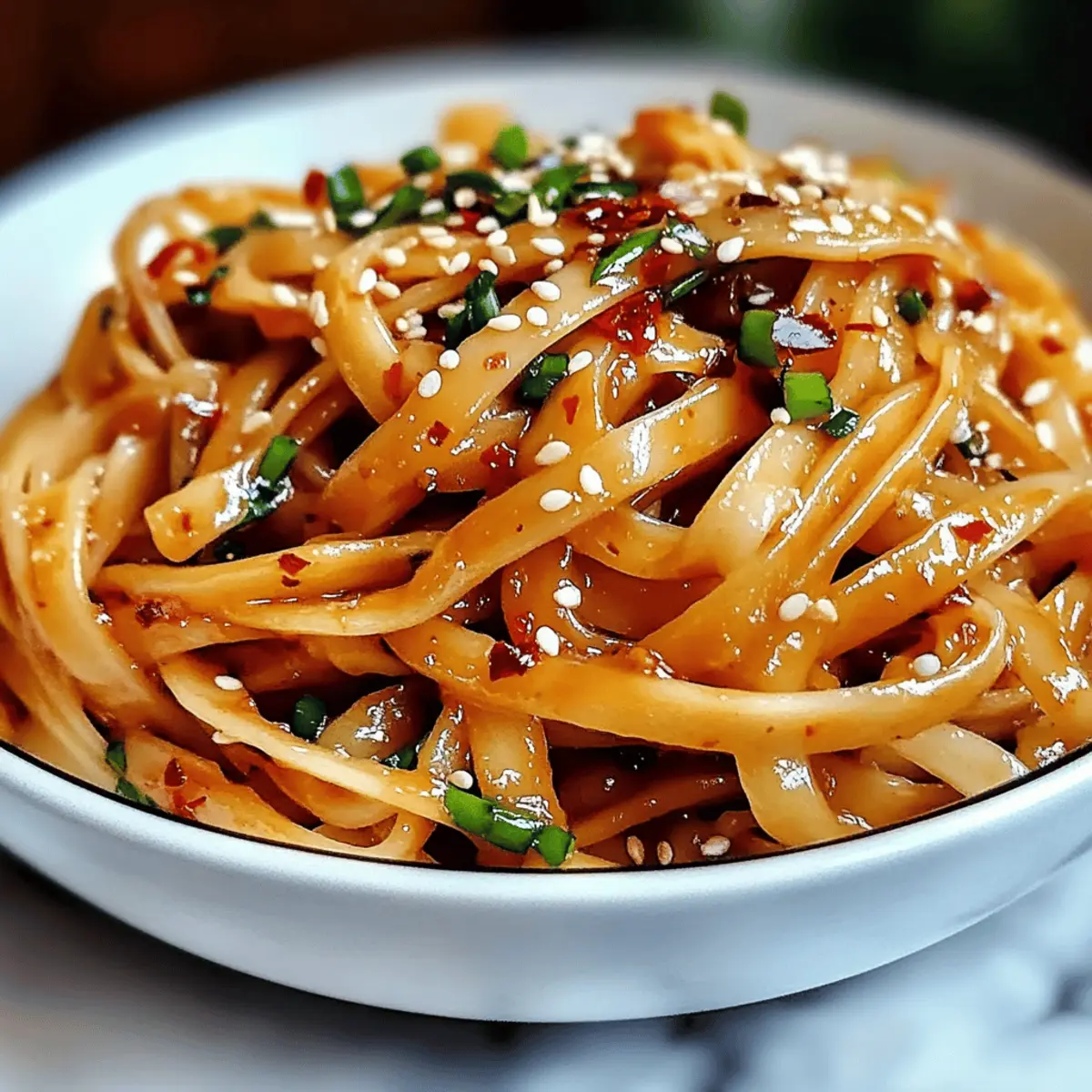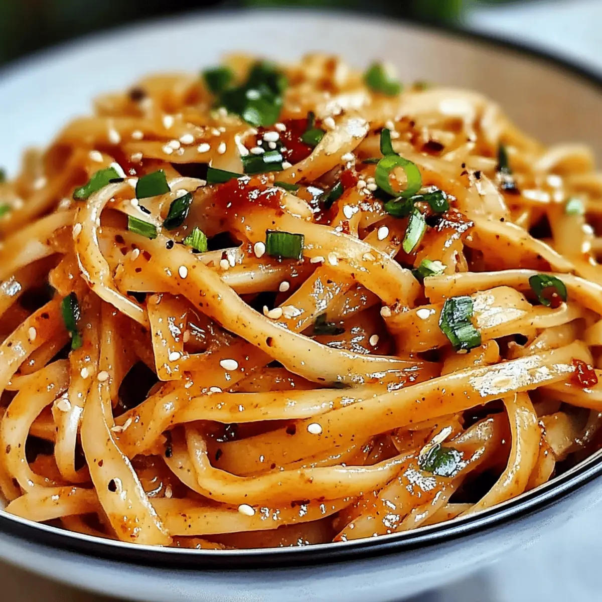 Remove the pan from heat and prepare to garnish your Spicy Chili Garlic Noodles. Top them with chopped green onions, toasted sesame seeds, and optional fresh herbs like cilantro or Thai basil for an extra burst of freshness. Serve immediately with lime wedges on the side to squeeze over and brighten each flavorful bite.