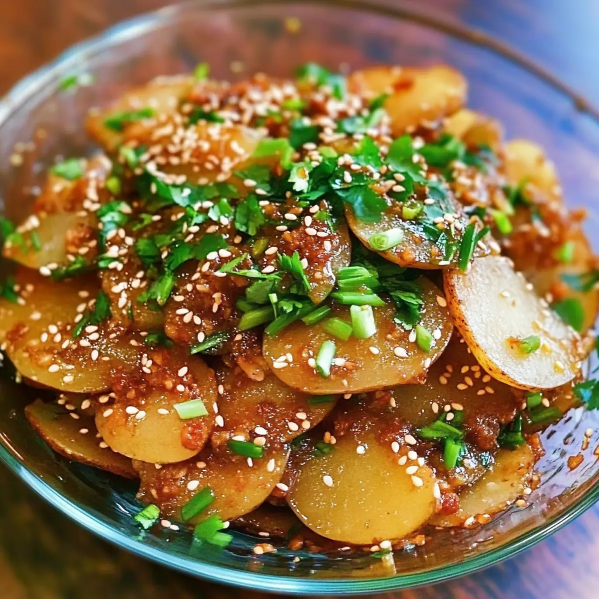 - Drizzle the sauce generously over cooled potatoes, tossing gently to coat. Sprinkle with sesame seeds and cilantro before serving.