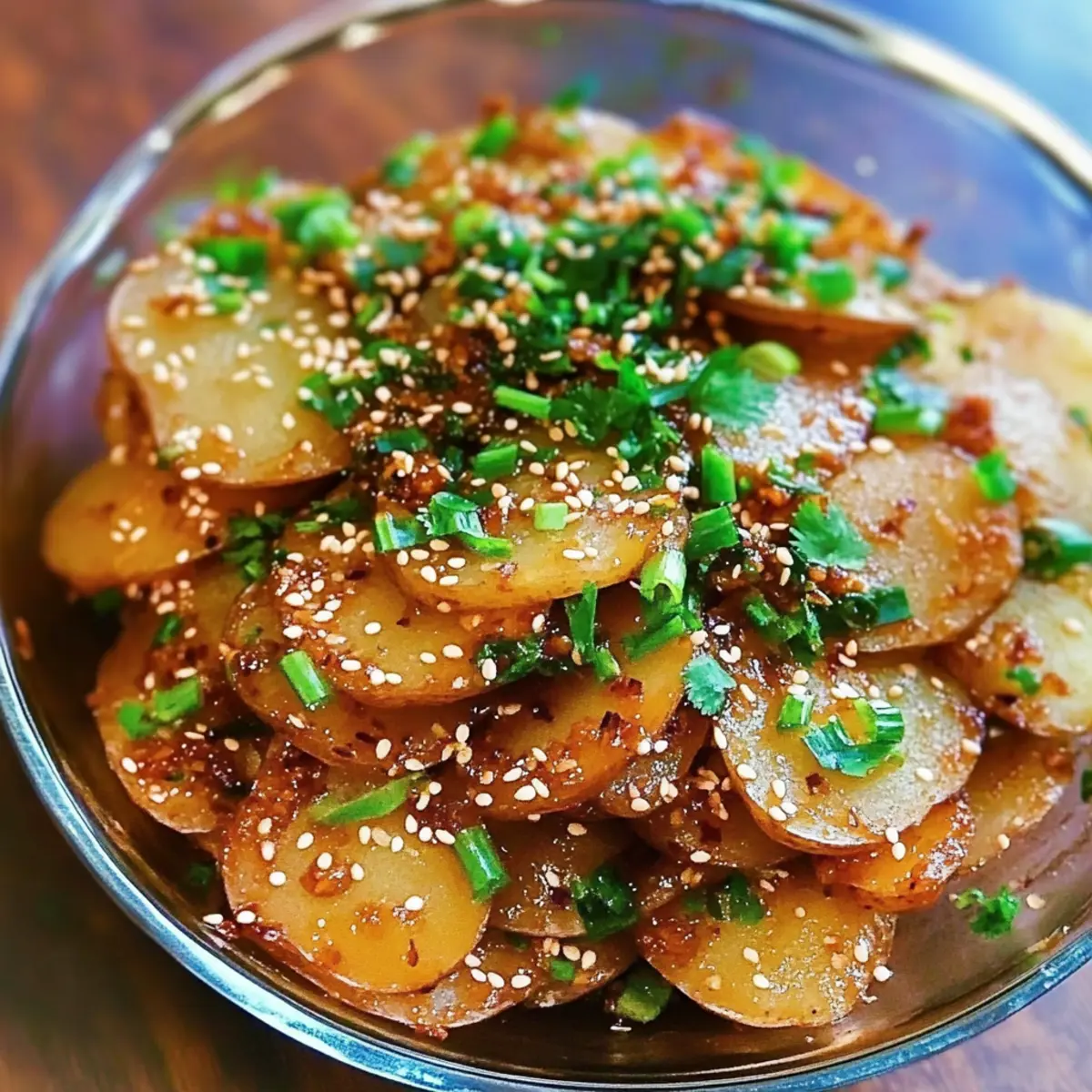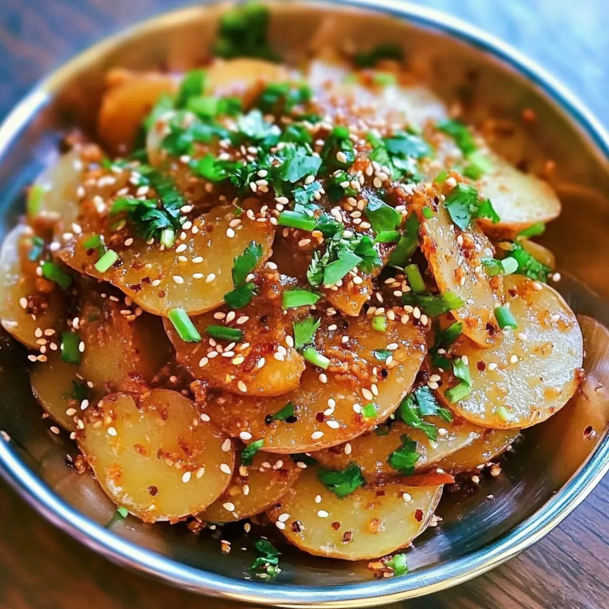 Once the sauce is ready, drizzle it generously over the cooled potatoes in a serving bowl. Toss the potatoes gently to ensure they are coated evenly in that fiery garlic sauce. Finally, sprinkle with sesame seeds and freshly chopped cilantro for added flavor and presentation. Serve your Spicy Garlic Potatoes immediately and watch them disappear!