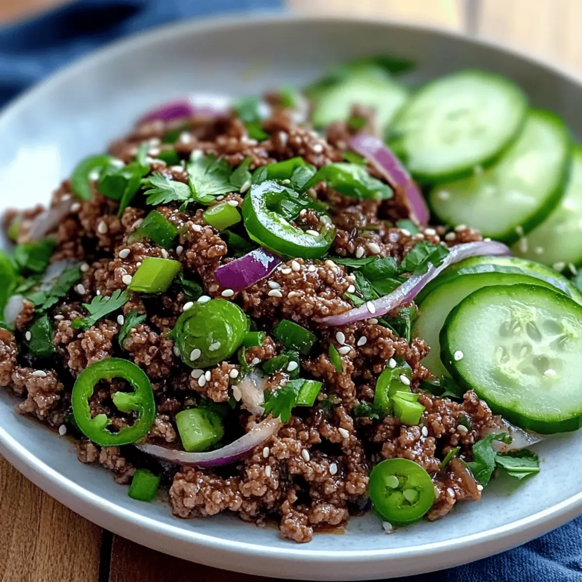Sizzling on the stovetop, that unmistakable aroma of spicy goodness fills the air—it’s a sure sign that dinner is about to get exciting. My Quick Spicy Korean Ground Beef with Cucumber Salad has become a favorite in my kitchen, especially on busy weeknights when I crave something bold yet effortlessly easy to prepare. In just 25 minutes, you can whip up a delightful dish that’s both healthy and satisfying, making it perfect for those who want to break free from the fast food cycle. The savory ground beef pairs beautifully with a refreshing cucumber salad, creating a vibrant contrast that elevates any meal. Plus, it’s adaptable for meal prep or low-carb versions, ensuring everyone at the table leaves happy. Are you ready to dive into this delicious flavor adventure?