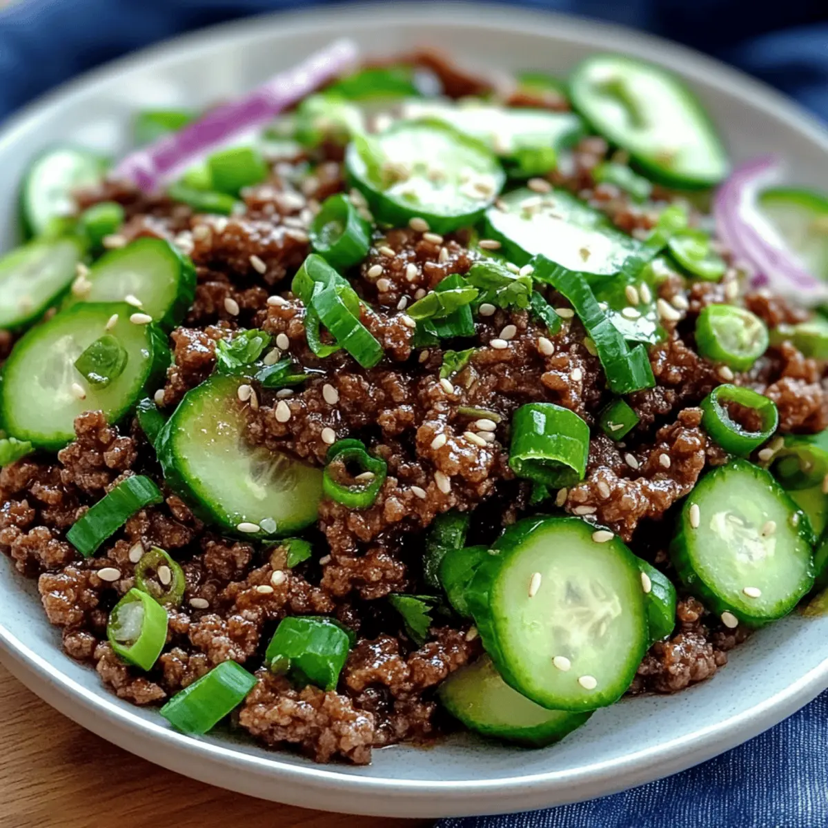 To serve, place a generous portion of the Spicy Korean Ground Beef on a plate, and top it with the prepared cucumber salad. For an extra touch of flavor, garnish with sesame seeds and sliced green onions. This vibrant presentation will make your dish not only delicious but visually appealing as well.