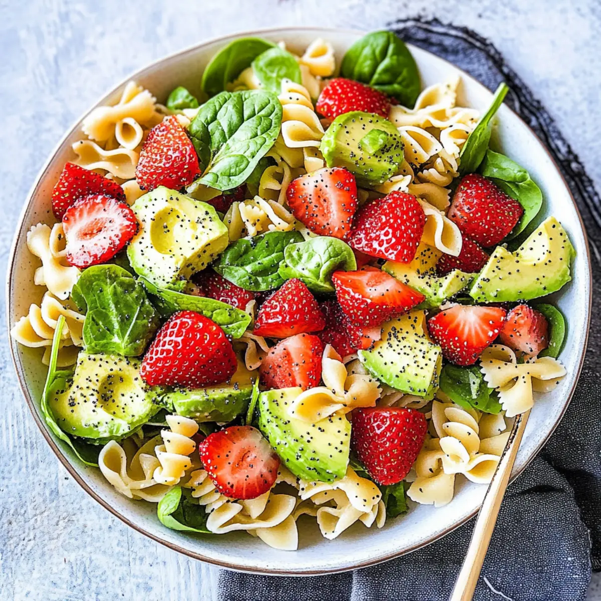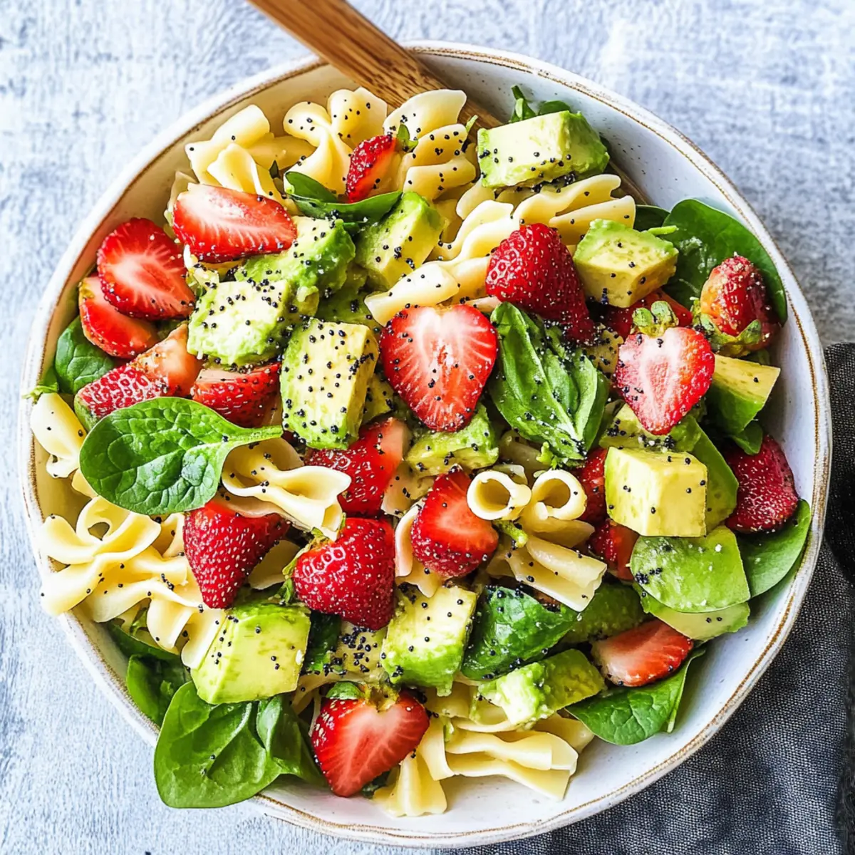 - Combine the Salad: In a large bowl, combine cooled pasta, spinach, strawberries, avocados, and green onions. If using, add poppy seeds.