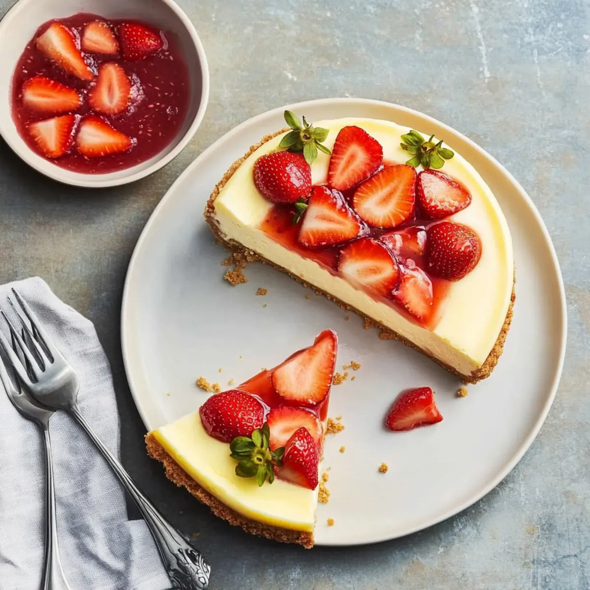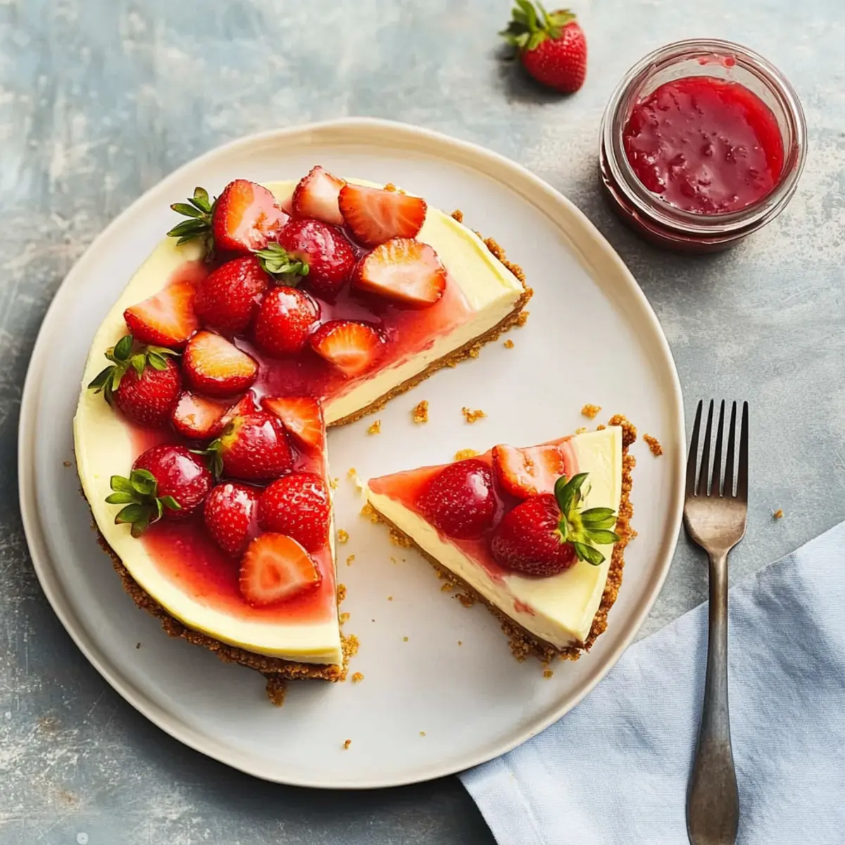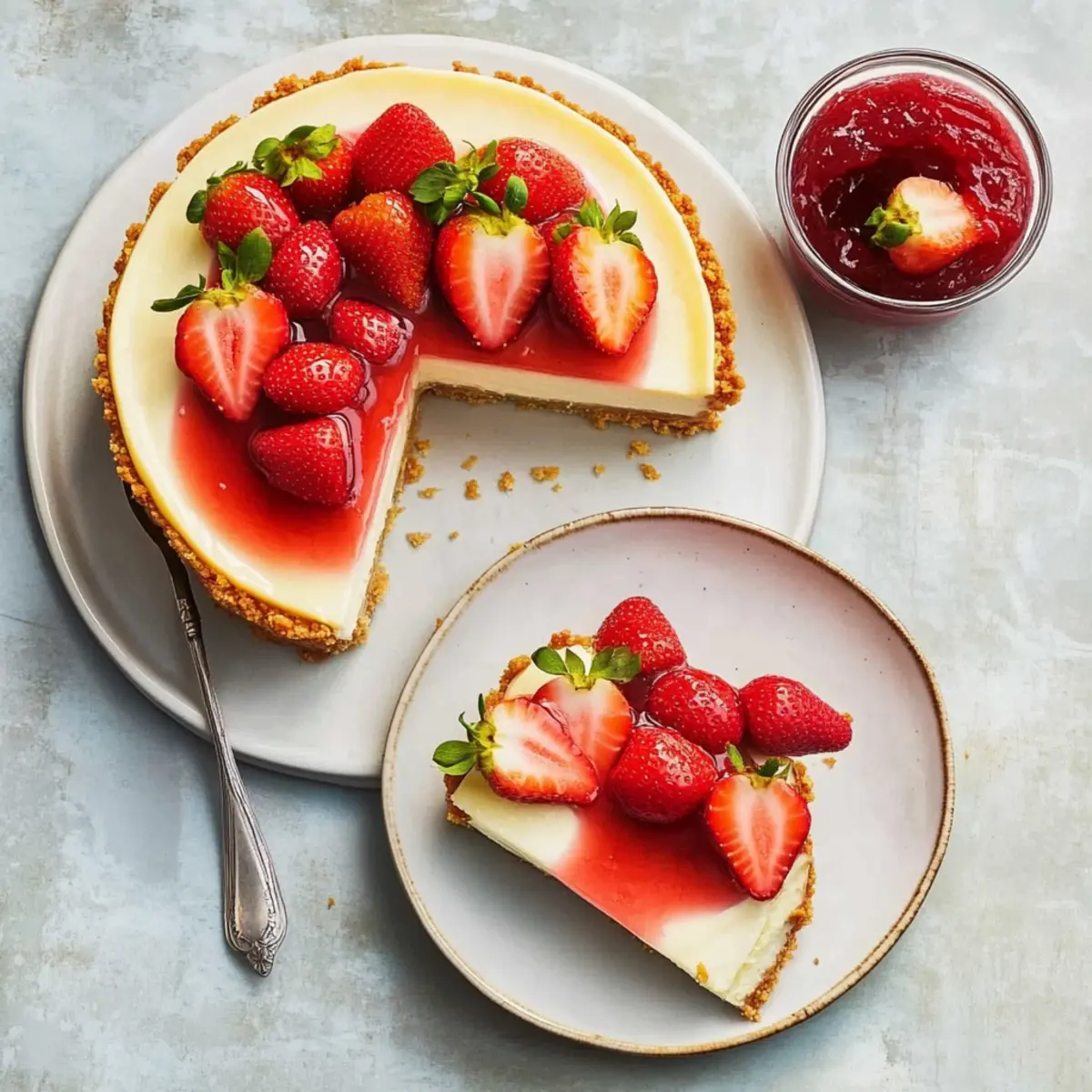 - Spread strawberry jam over the cheesecake and top with fresh strawberries before serving.