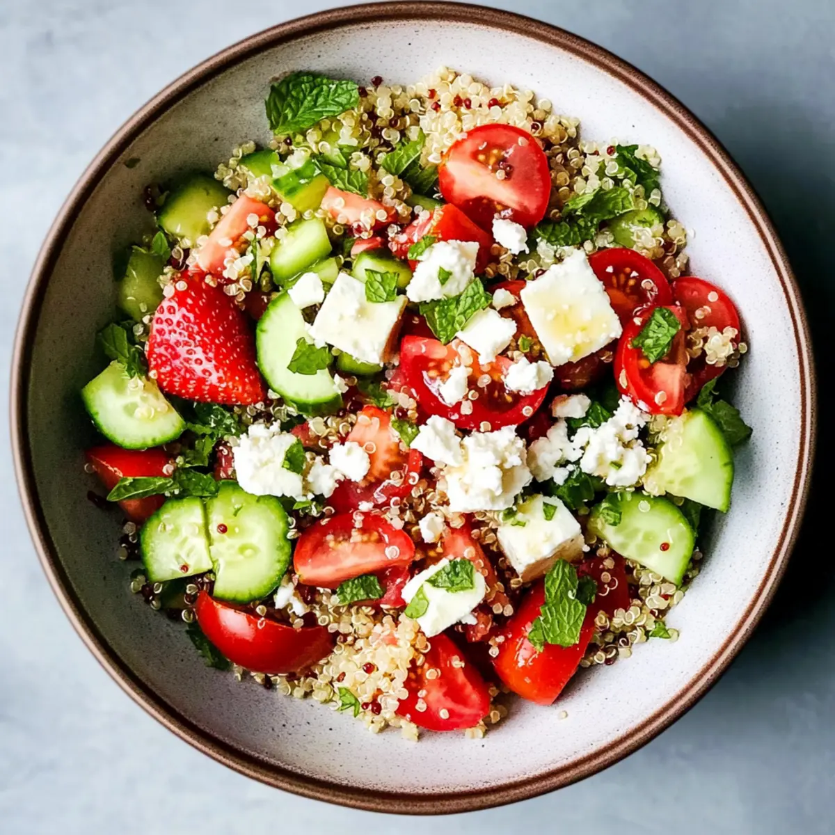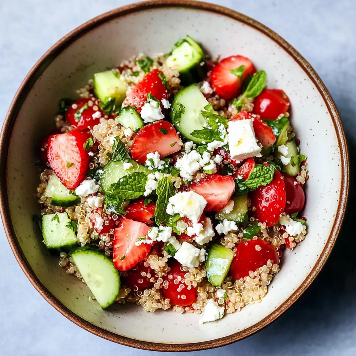 This Strawberry Quinoa Salad is a fantastic choice for meal prep enthusiasts saving time during busy weeknights! You can prepare all the chopped vegetables and combine them with the cooked quinoa up to 3 days in advance, storing them in an airtight container in the refrigerator. To maintain the salad’s crispness, however, it’s best to add the cucumbers just before serving. Additionally, you can whisk the dressing—olive oil and lemon juice—and store it separately for up to 24 hours to ensure the flavors remain fresh. When you’re ready to enjoy this vibrant dish, simply drizzle the dressing over the prepared ingredients, toss, and top with feta for a delightful, refreshing meal!