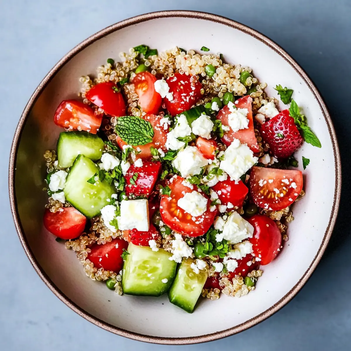 - Finally, when you're ready to serve, dish out the chilled salad into individual bowls and sprinkle your choice of feta cheese on top, adding a delightful creaminess to each bite. Enjoy this vibrant Strawberry Quinoa Salad as a nutritious light meal or a side dish at your next gathering!