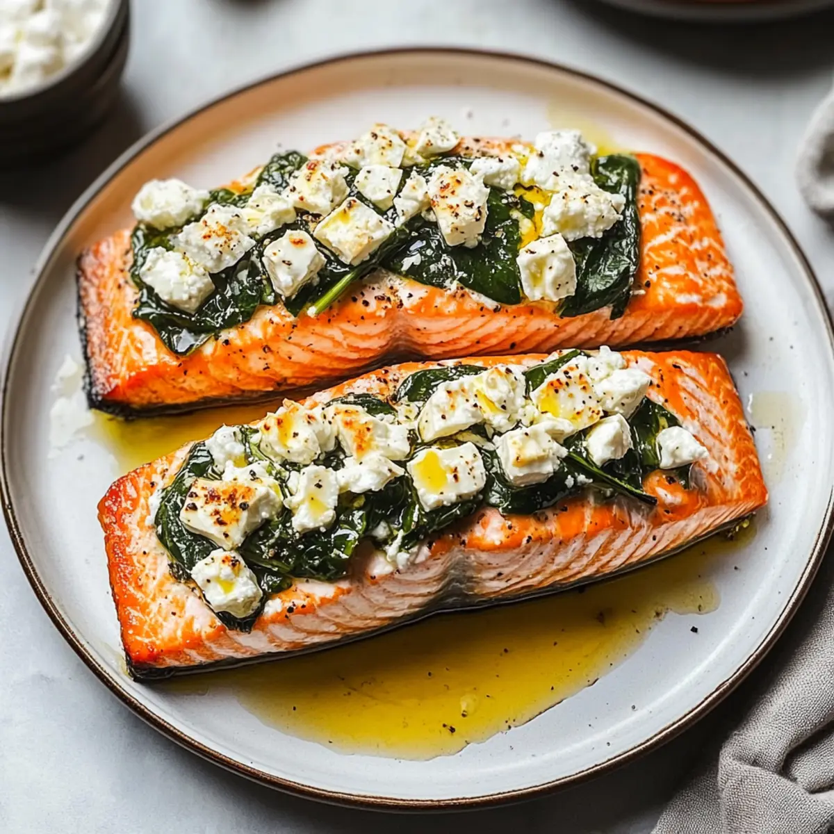 To ensure a perfect Stuffed Salmon With Spinach & Feta, avoid cutting the pocket too deep; cutting all the way through can lead to spillage during baking. Additionally, always check for doneness at around the 12-minute mark, as overcooking can result in dry fish. Aim for it to be opaque and flaky—it’s a game-changer!