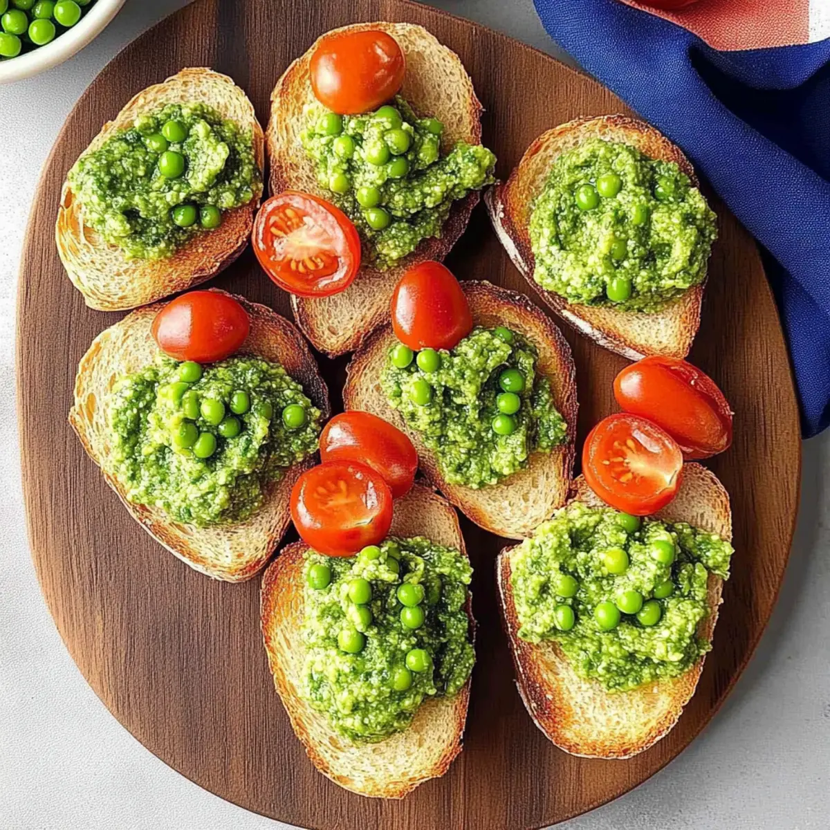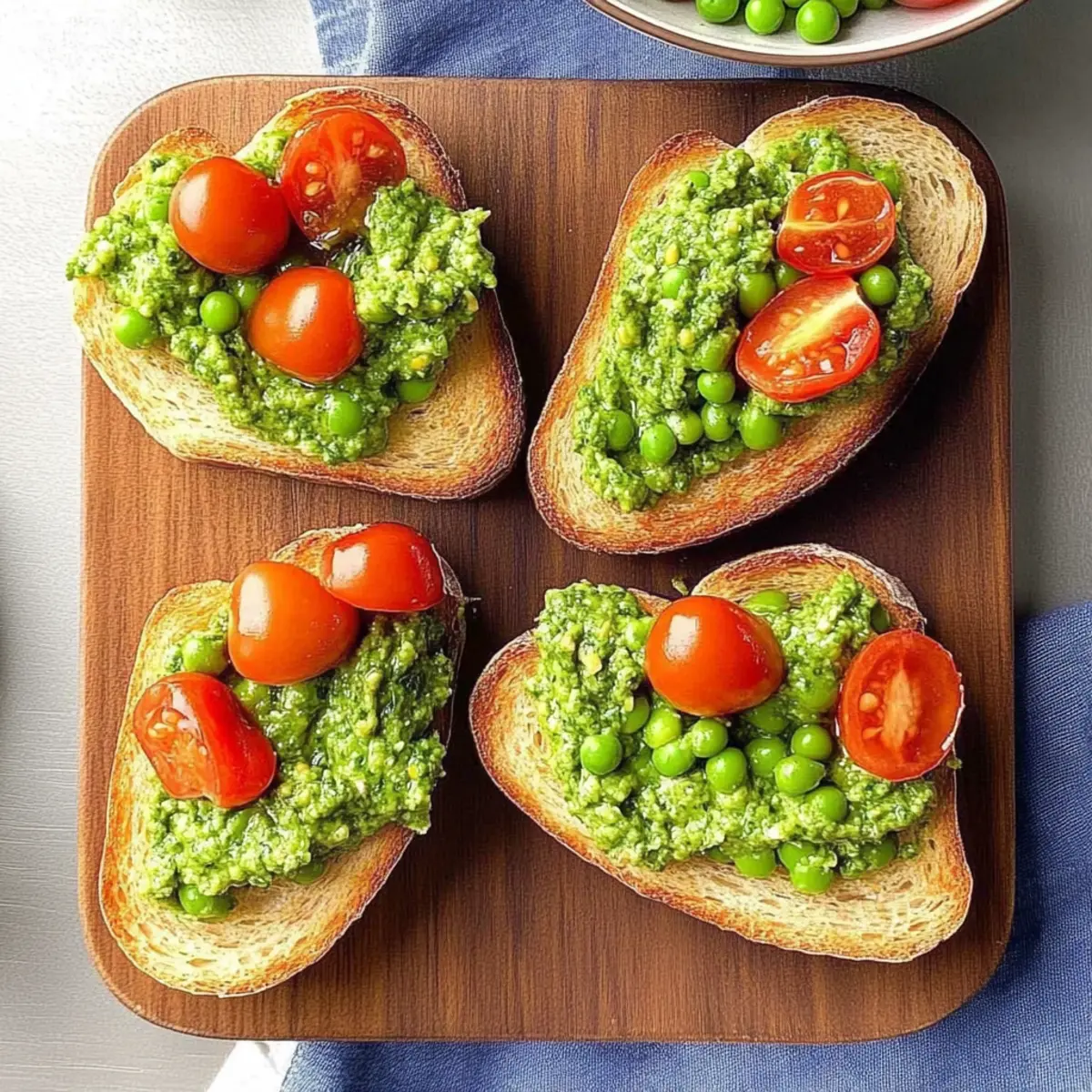 - Classic Bruschetta: This Italian favorite with tomatoes, basil, and balsamic vinegar offers a deliciously similar vibe that intertwines beautifully with the pea pesto.