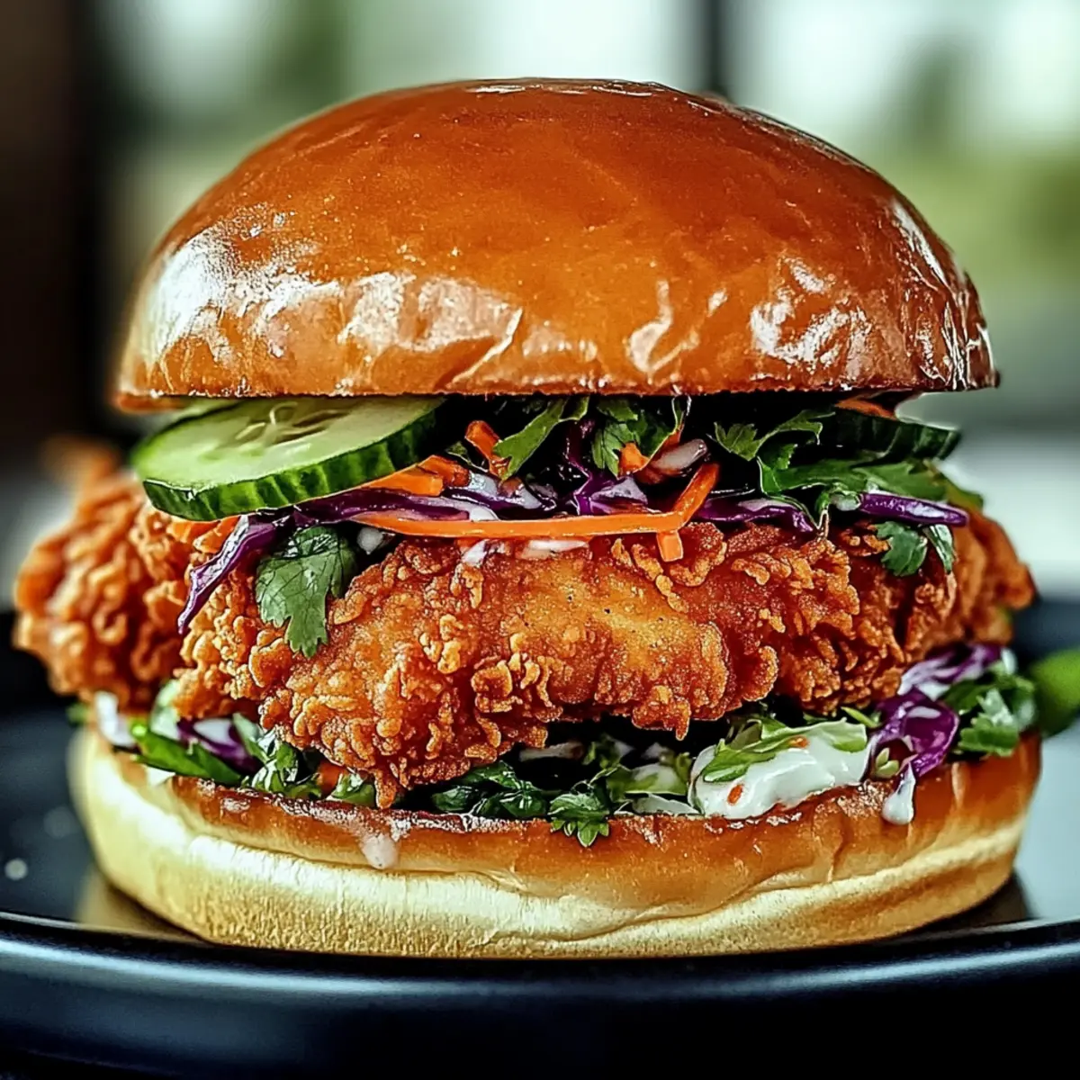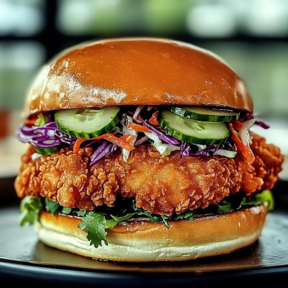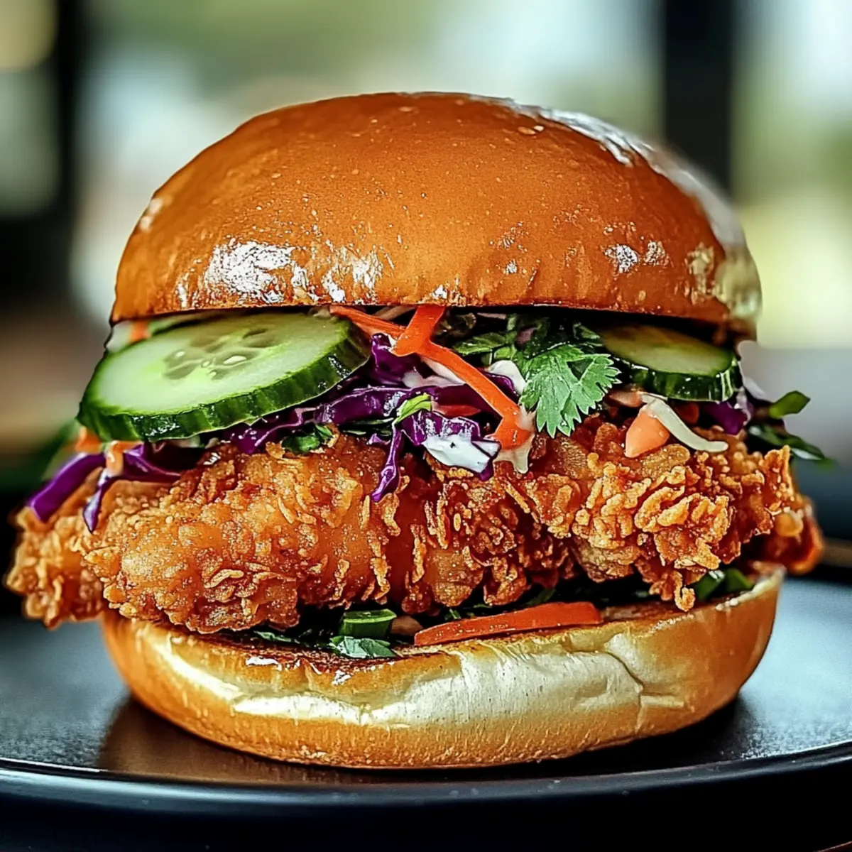 Now it’s time for the delicious assembly! Begin by toasting the brioche buns until golden. Spread a generous layer of spicy mayo on the bottom half, followed by a piece of the crispy fried chicken. Top with the refreshing slaw, a sprinkle of fresh cilantro, and sliced cucumbers for added crunch. Finally, cap it with the top bun, and your Thai Fried Chicken Sandwich is ready to be savored!