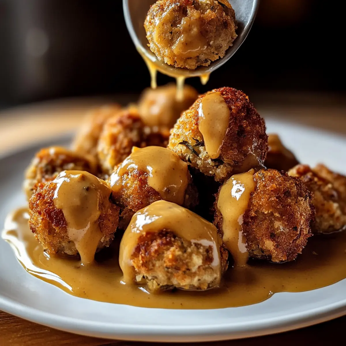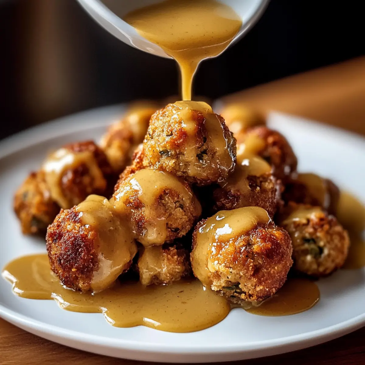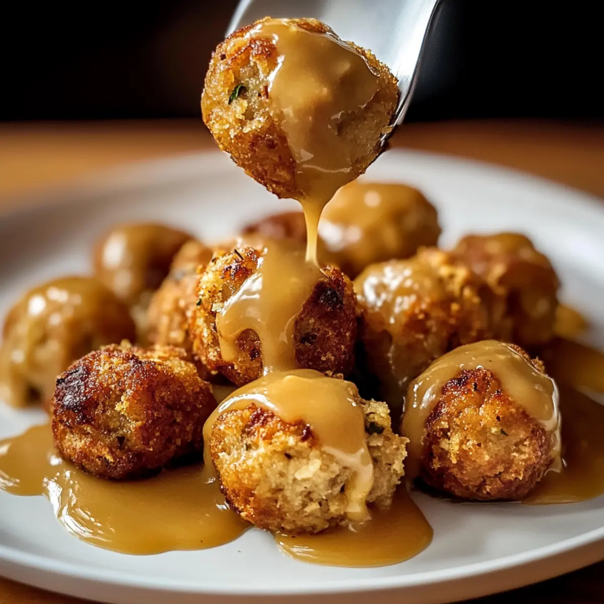 Savory Gravy: A classic companion that adds a rich depth, elevating the stuffing balls to a whole new level of savory bliss and moisture. A drizzle of warm gravy enhances every bite, making it an irresistible pairing.