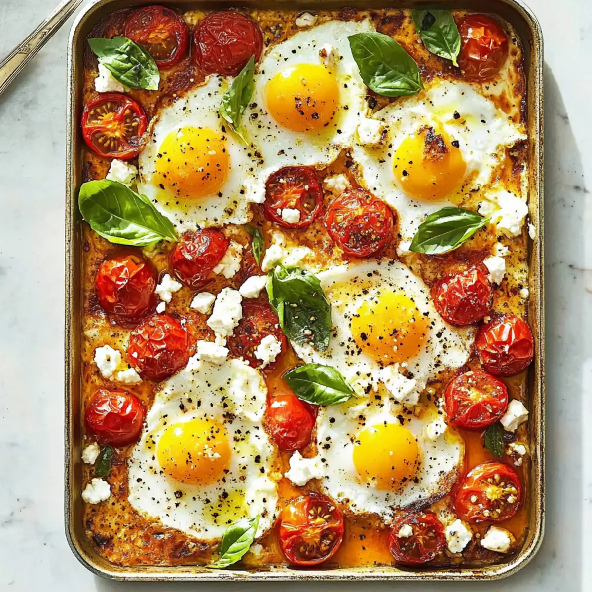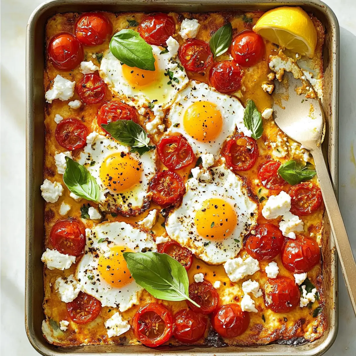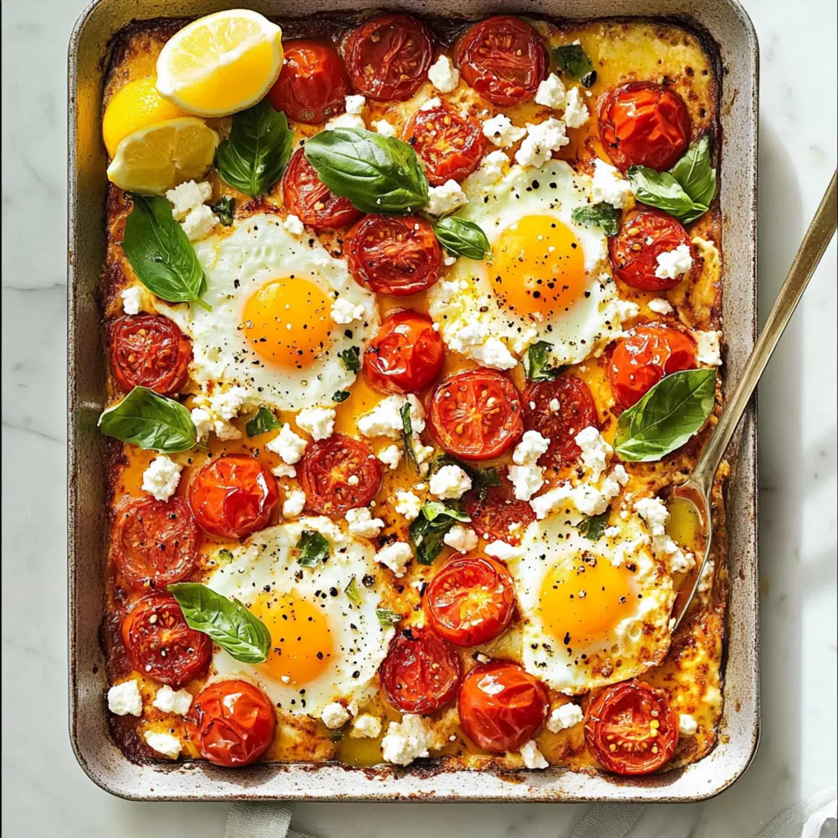 Once the eggs are just set, take the baking sheet out of the oven. Finish your Tomato and Feta Baked Eggs by garnishing with fresh basil leaves and a squeeze of lemon juice to brighten the flavors. Serve hot with toasted country bread and a side of mixed greens for a delightful brunch experience that highlights the Mediterranean charm of this dish.