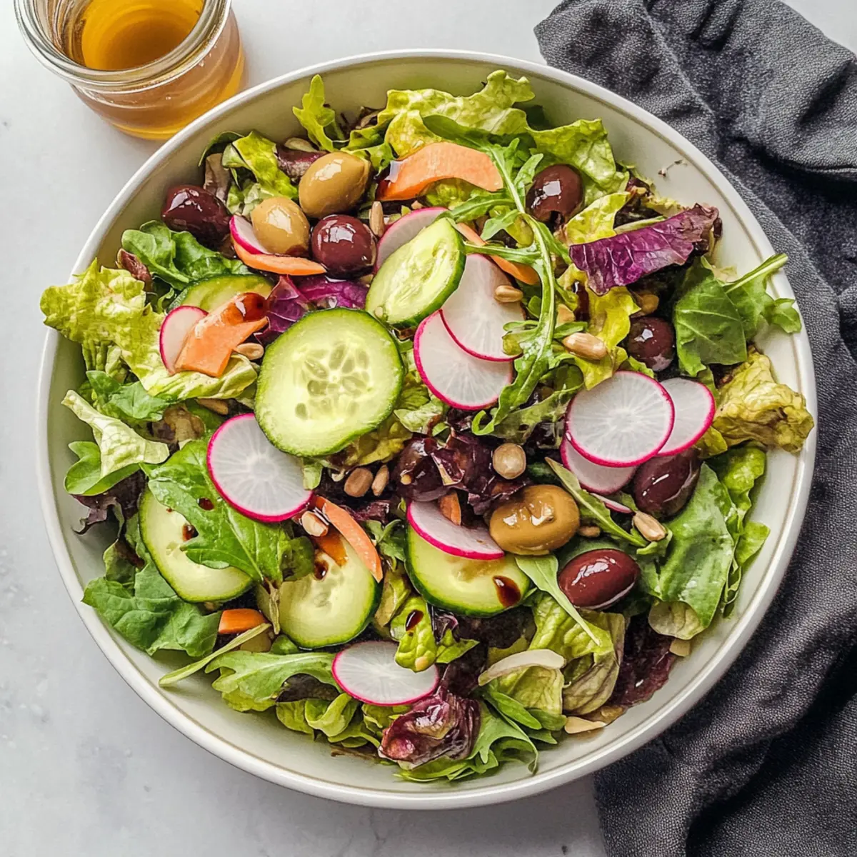 In a large mixing bowl, combine mixed lettuce leaves, arugula, chopped cucumber, sliced radish, and diced red onion. Add pitted olives and a sprinkling of sunflower seeds to enhance crunch. Carefully wash and dry your greens beforehand to keep them crisp, and make sure all vegetables are fresh and vibrant, setting the stage for a delightful tossed salad.