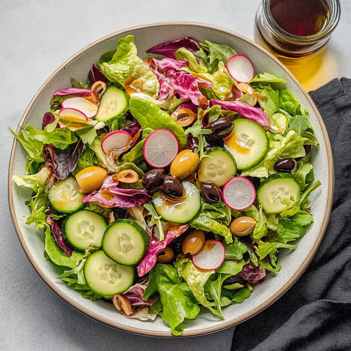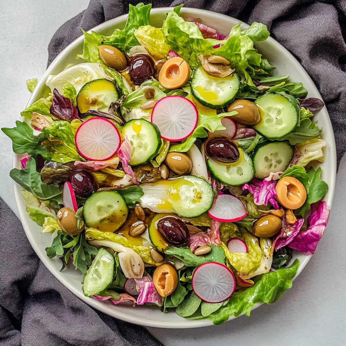 - In a large mixing bowl, combine mixed lettuce leaves, arugula, chopped cucumber, sliced radish, and diced red onion. Add pitted olives and a sprinkling of sunflower seeds to enhance crunch. Carefully wash and dry your greens beforehand to keep them crisp.