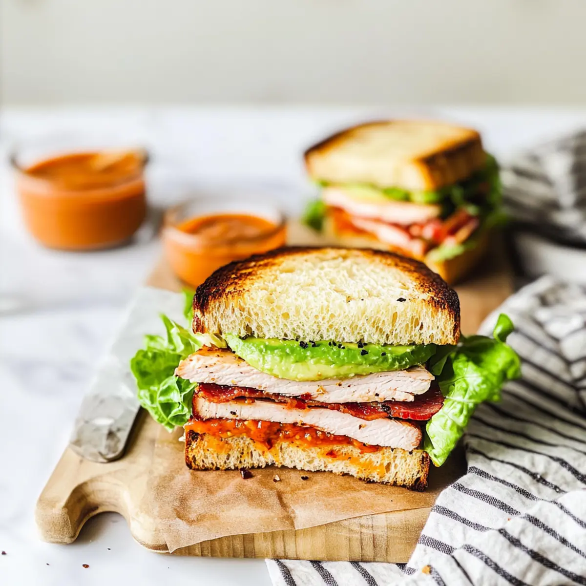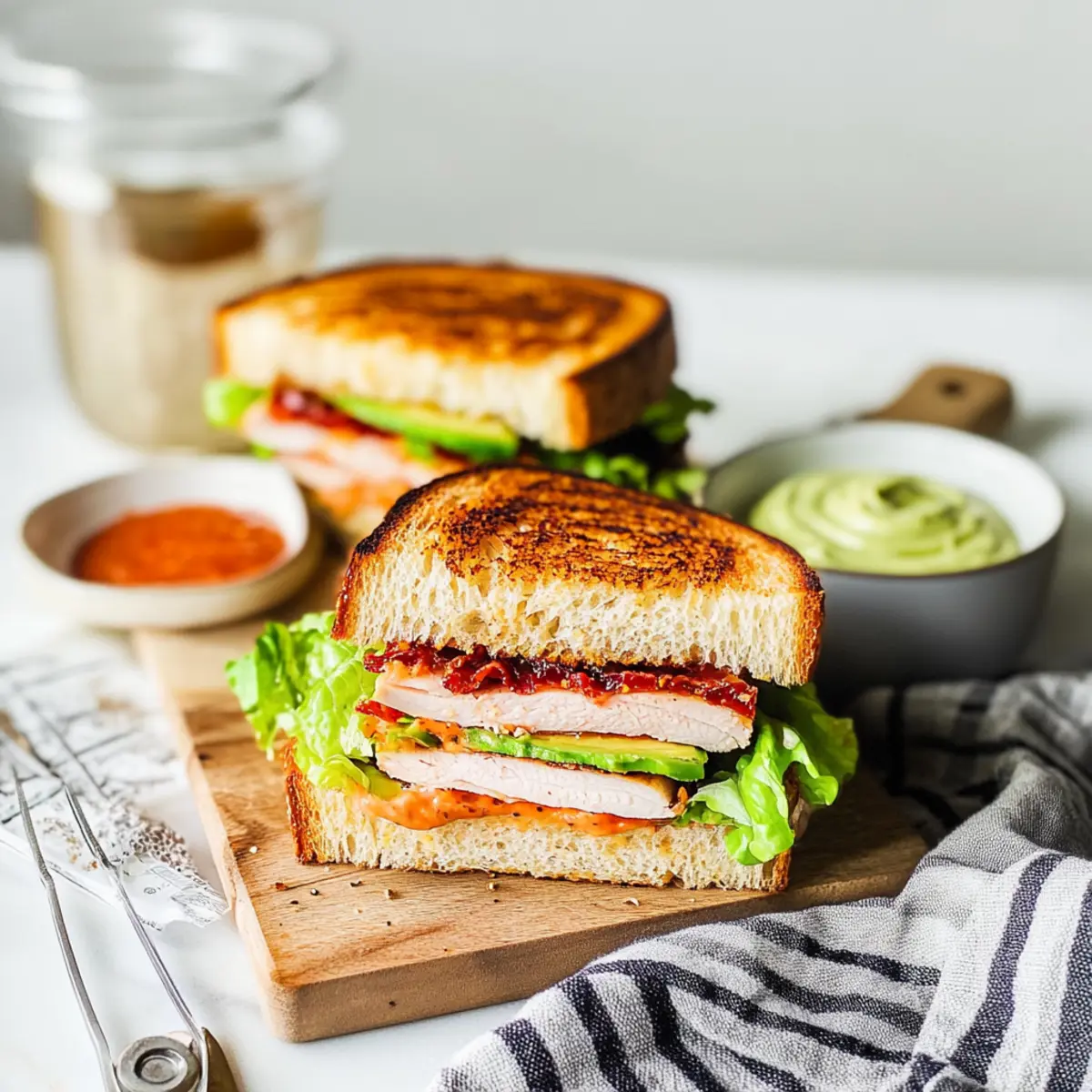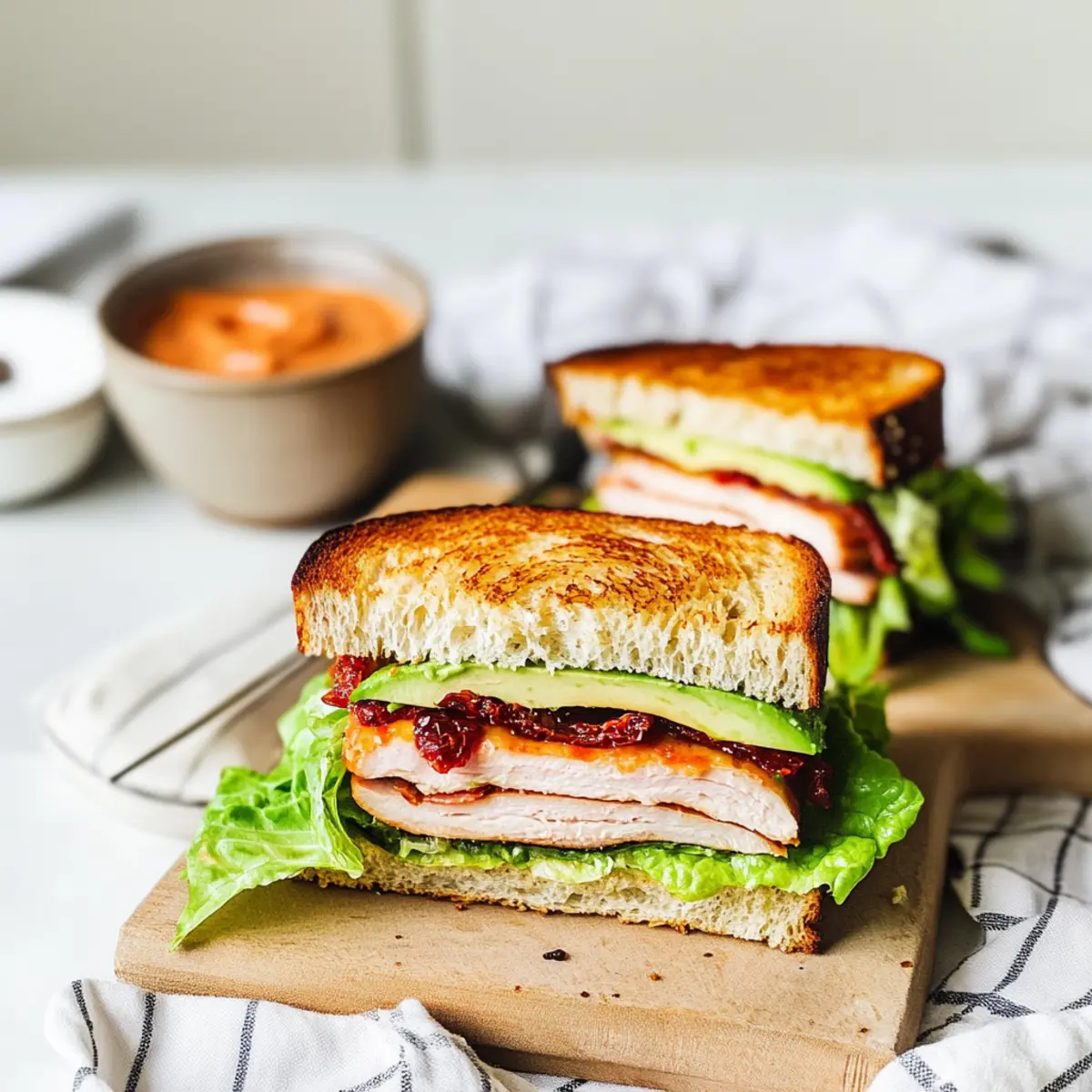 These Turkey Club Sandwiches are perfect for meal prep enthusiasts! You can make the sun-dried tomato aioli and cook the bacon up to 3 days in advance, storing them separately in airtight containers in the refrigerator. When you’re ready to enjoy your Turkey Club Sandwich, simply layer the turkey, bacon, and fresh ingredients between slices of your prepared bread. For the freshest taste, assemble the sandwiches right before serving, as this will keep the bread from becoming soggy. Remember, keeping the aioli and bacon separate until assembly ensures that your sandwiches remain delicious and satisfying, making your lunchtime rush a breeze!