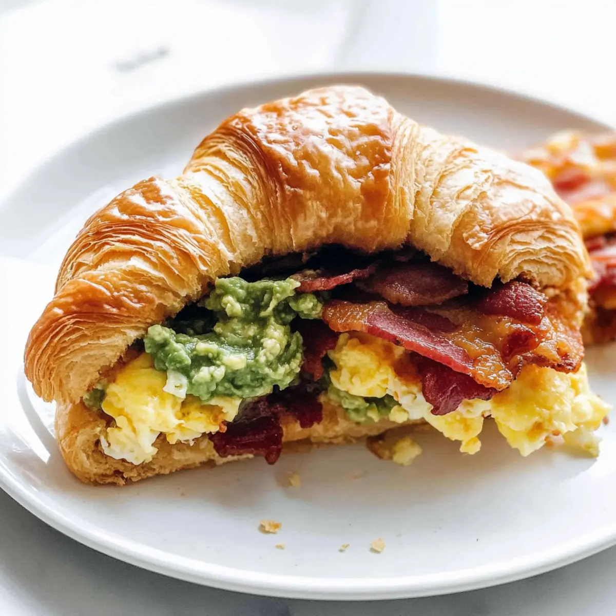 - Layer each croissant bottom with scrambled eggs, bacon, cheese, guacamole, and garlic butter tomato sauce, then cover with the top half.