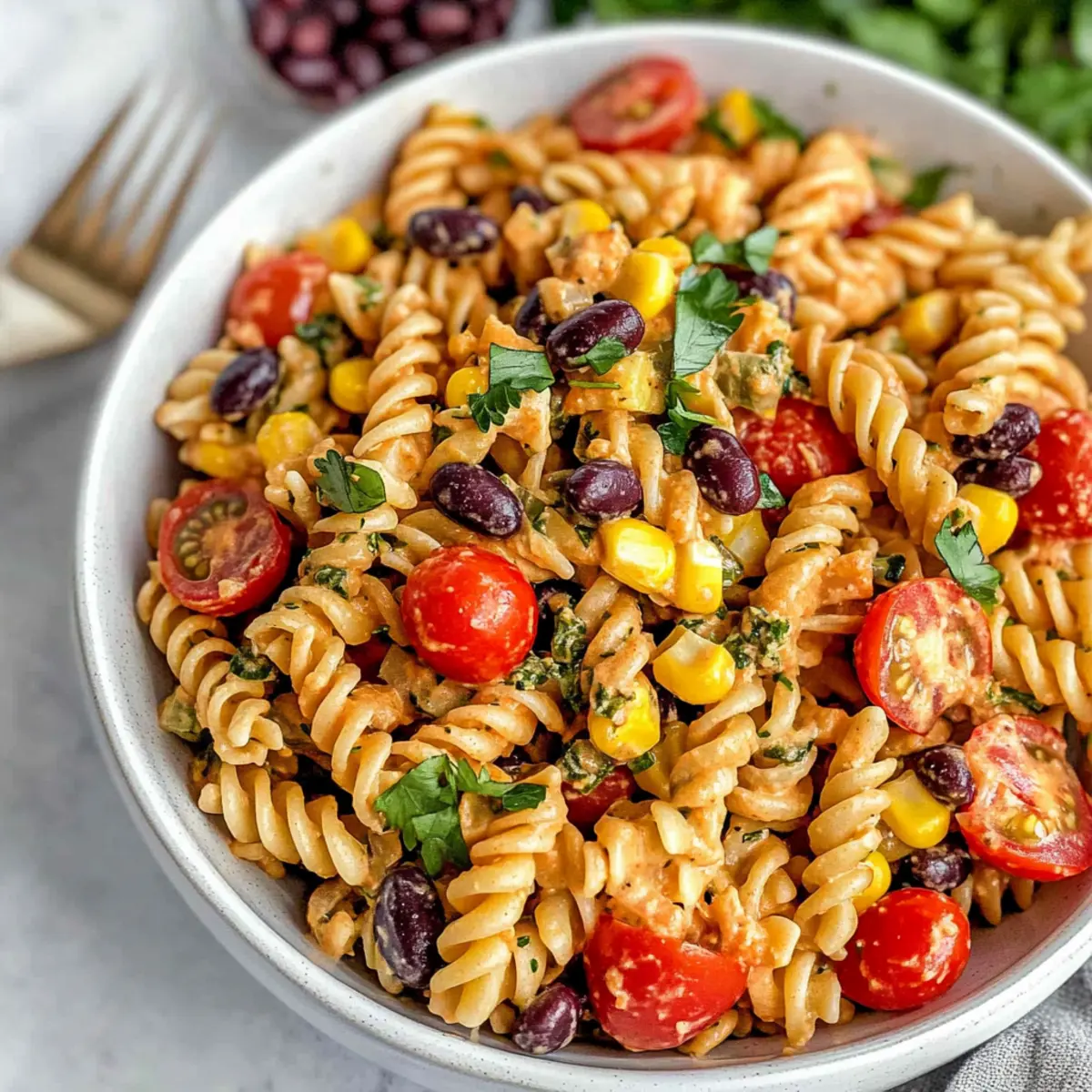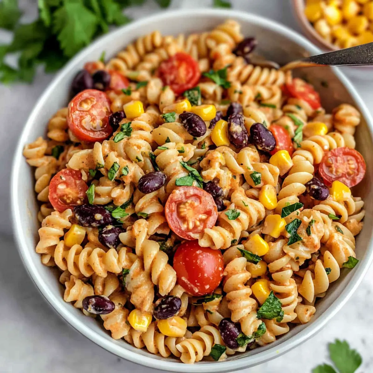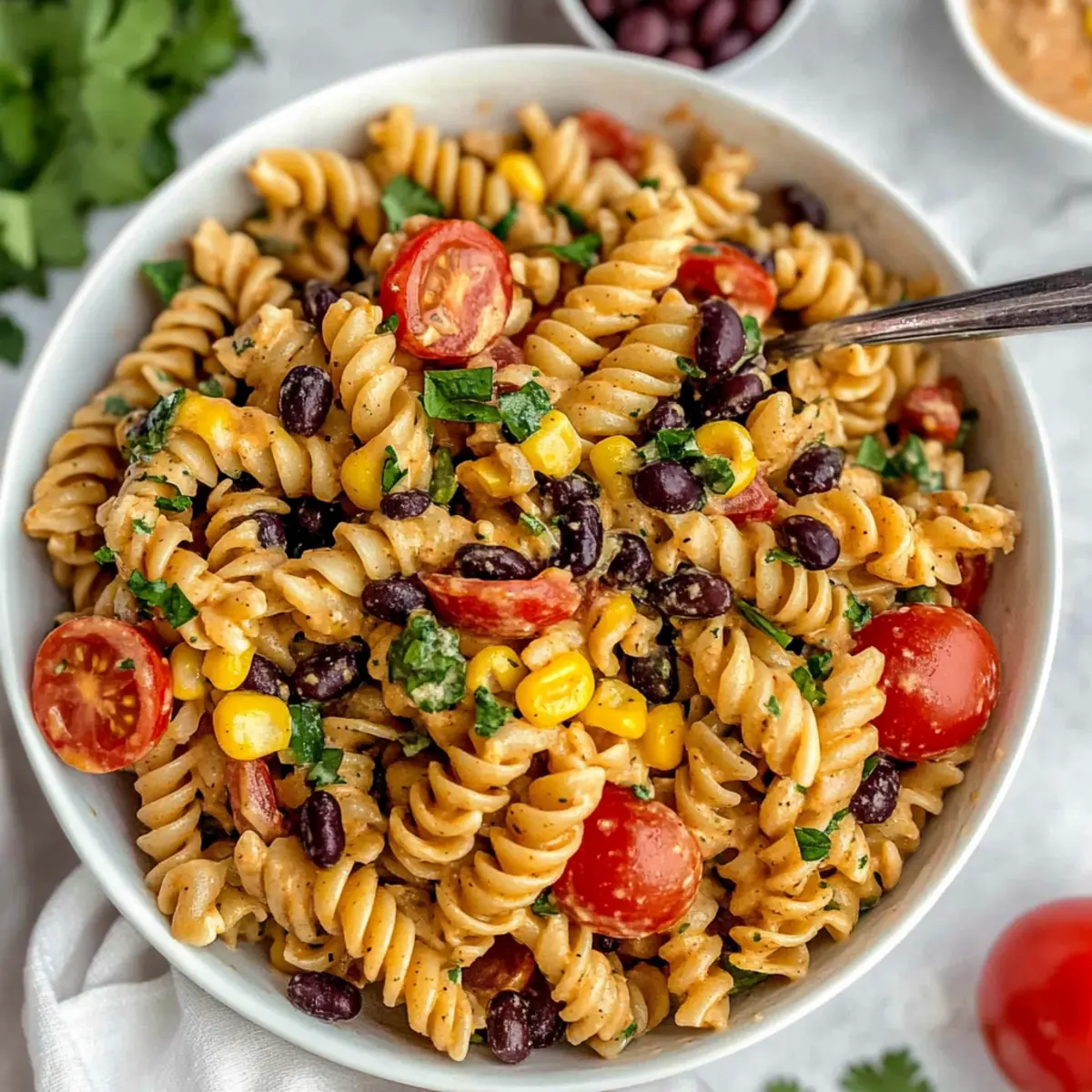 Vibrant Colors: This Creamy Vegan Southwest Pasta Salad is a feast for the eyes with its cheerful medley of fresh veggies.