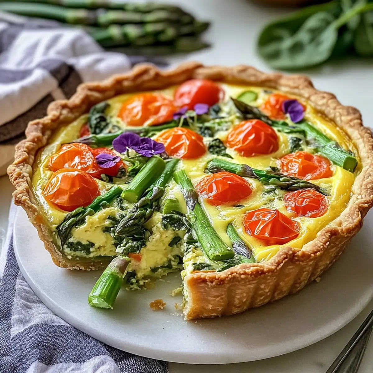 Vibrant Ingredients: This quiche bursts with color and goodness from tender asparagus, juicy tomatoes, and nutritious spinach.