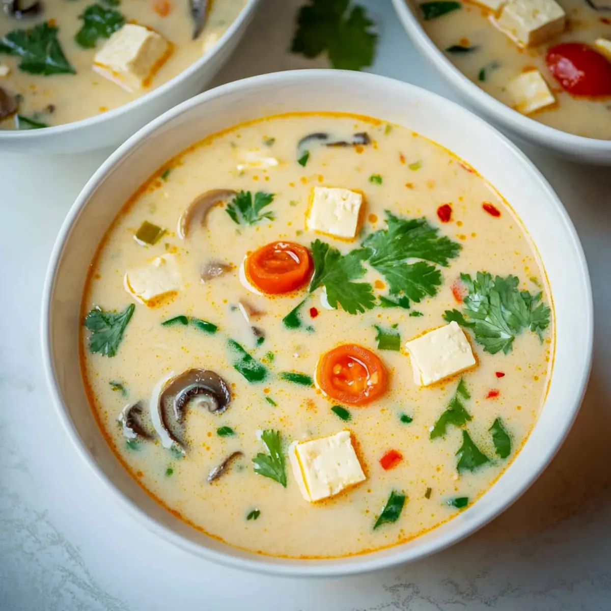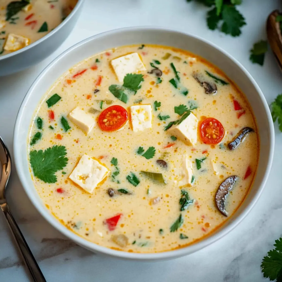 Ladle the warm soup into bowls and finish with a sprinkle of fresh cilantro and a drizzle of chili oil for an extra kick. This vibrant presentation highlights the soup’s tropical flavors and makes it irresistible to everyone at your table. Enjoy your creamy vegan tom kha soup as a satisfying meal or an inviting starter.
