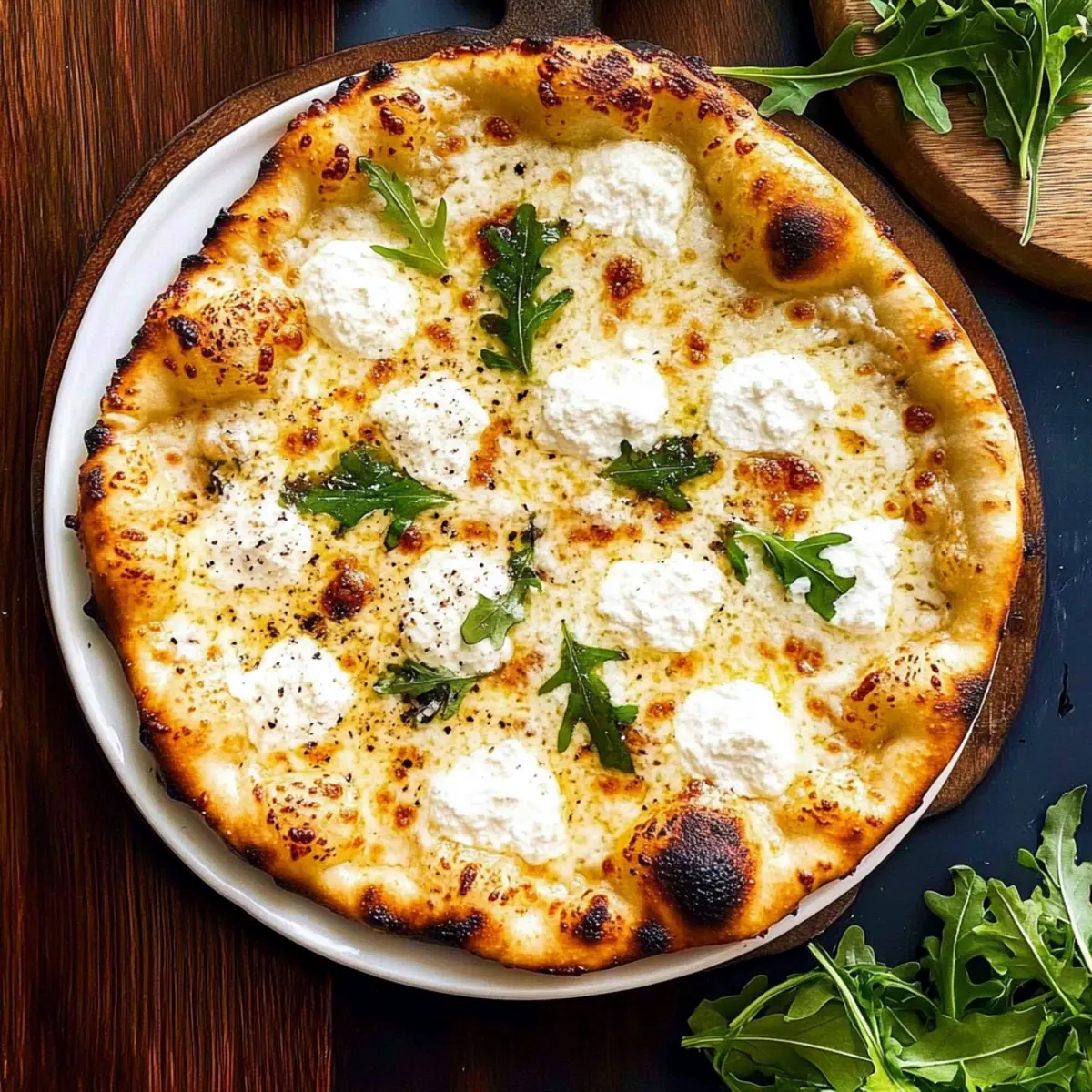 Once baked, carefully remove the pizza from the oven. Top it off with a generous handful of fresh arugula, drizzling extra parmesan if desired. The peppery arugula adds a refreshing contrast to the cheesy richness. Slice and serve immediately, enjoying this delightful homemade White Pizza with family and friends.