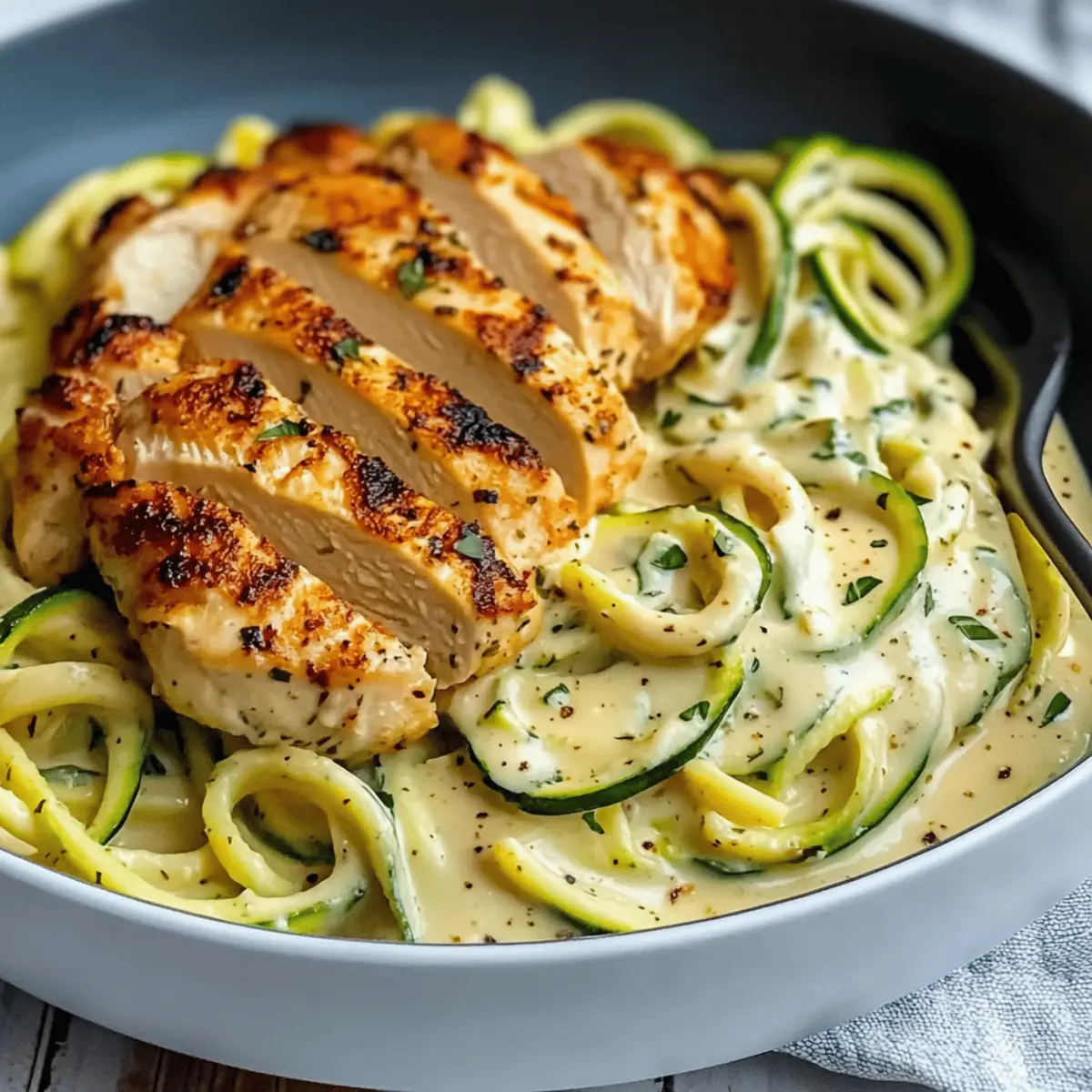 The aroma of sizzling garlic wafts through my kitchen as I pull together a dish that has become a weeknight staple—Creamy Zucchini Noodle Chicken Alfredo. This delightful recipe offers the comforting richness of classic Alfredo while transforming it into a lighter, low-carb option that won’t weigh you down. Just imagine juicy, garlicky chicken enveloped in a velvety Parmesan sauce, perfectly coating tender zucchini noodles, all in a quick 35 minutes! This dish is not only a lifesaver for those busy evenings but also a fantastic gluten-free alternative that still celebrates the beloved flavors we crave. Ready to elevate your dinner game? Let’s dive into the cooking magic that’s about to unfold!